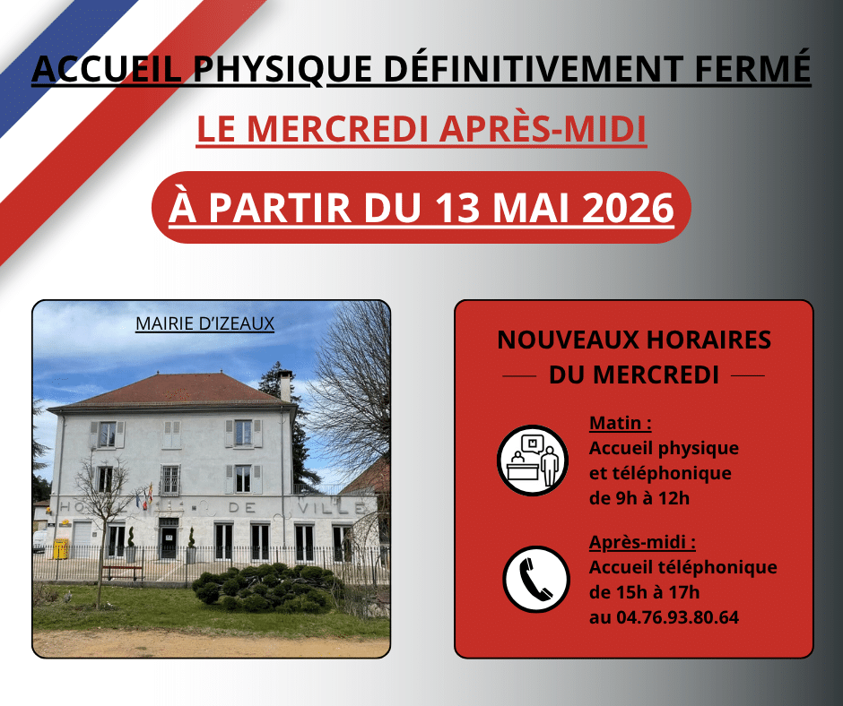 En raison d’une fréquentation insuffisante, l’accueil physique de la mairie sera désormais fermé le mercredi après-midi, à compter du 13 mai 2026.